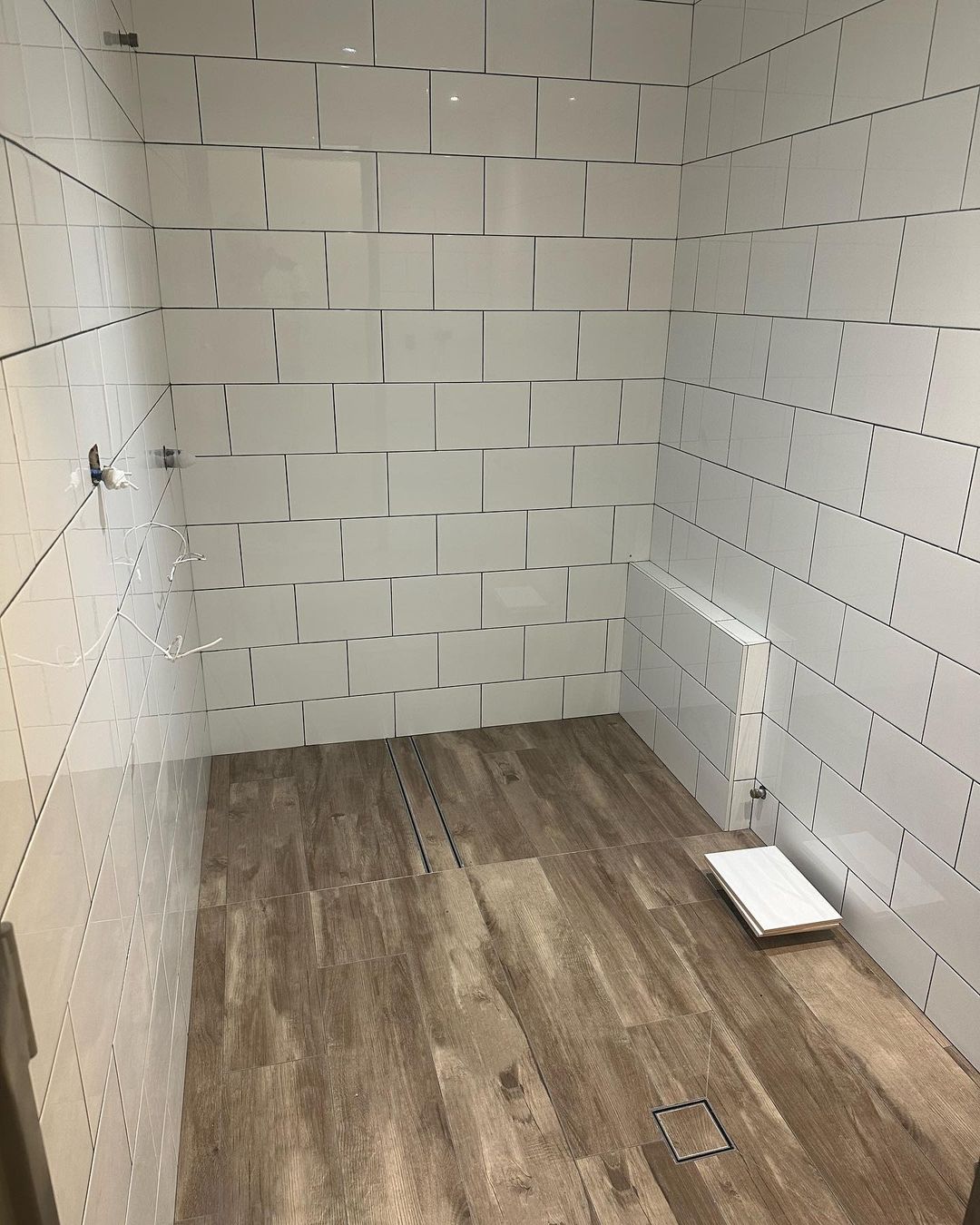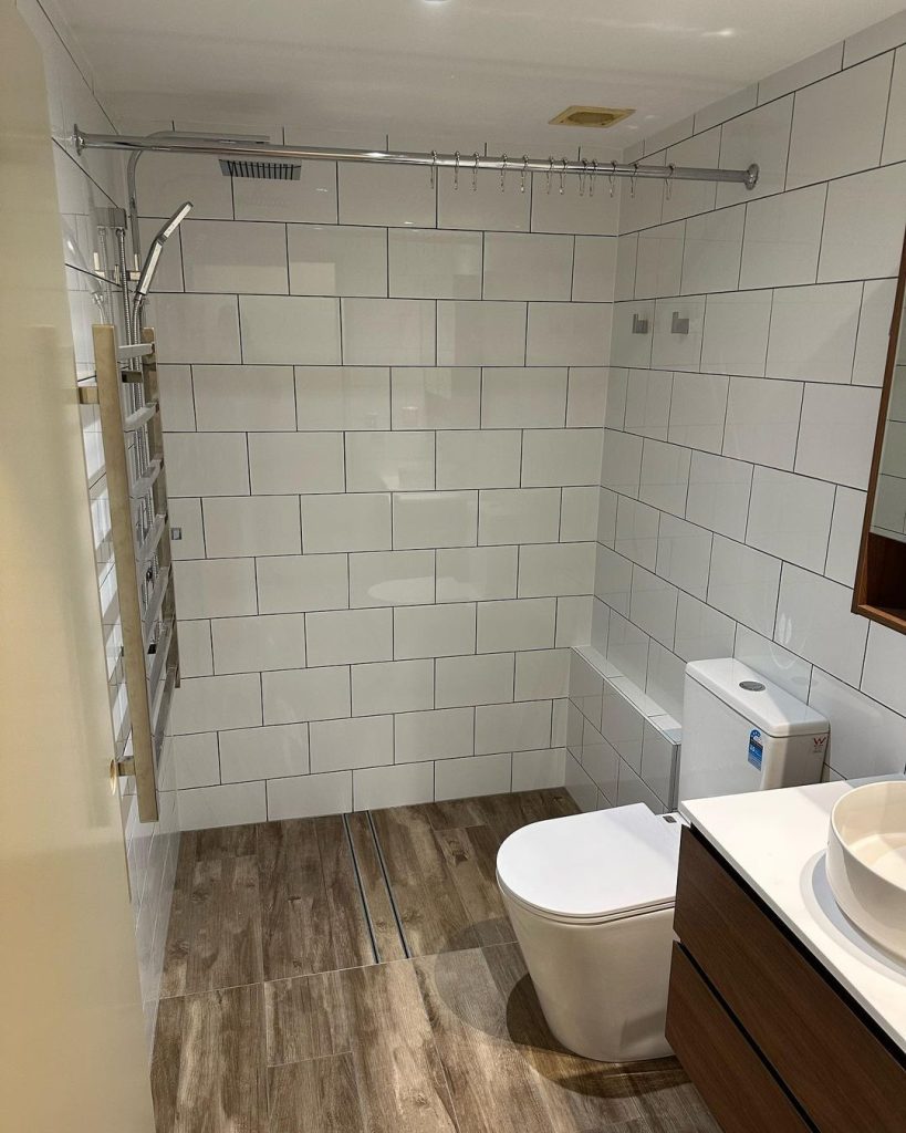 Our team got to work tearing out the old flooring, toilet, shower area, and fixtures and fittings. Once that was done, we redid the waterproofing and installed new elegant flooring, simple large white tiles, and brand new fixtures and fittings.